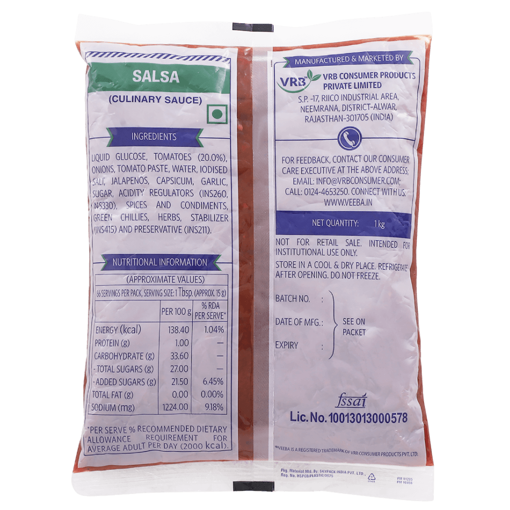 Veeba Salsa Sauce 1KG is a vibrant, flavorful tomato-based condiment with a chunky texture and a perfect blend of tomatoes, onions, herbs, and spices. It delivers a mildly spicy, tangy flavor that complements nachos, tacos, burritos, quesadillas, sandwiches, burgers, and grilled snacks.