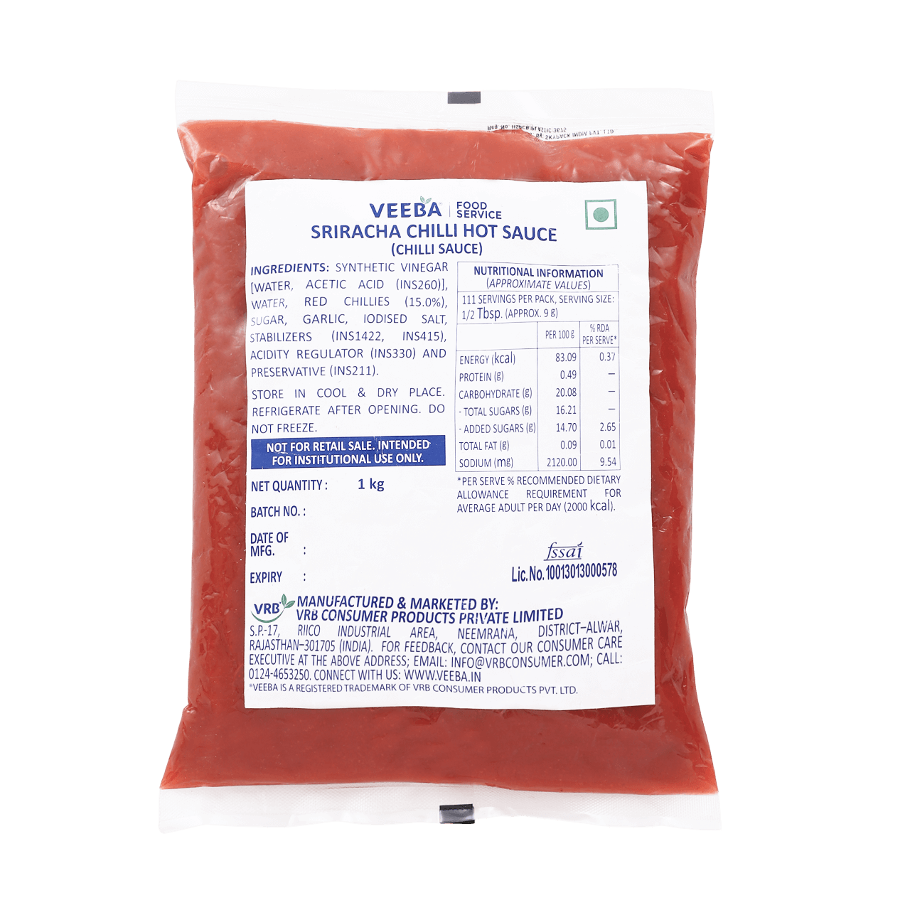 Veeba Sriracha Sauce 1KG is a bold and fiery Thai-style hot chili sauce made with red chilies, garlic, vinegar, and spices, offering a smooth, tangy, and spicy kick. Known for its vibrant flavor, it's widely used in wraps, noodles, burgers, fried rice, sushi, dumplings, and as a dip for fried snacks.